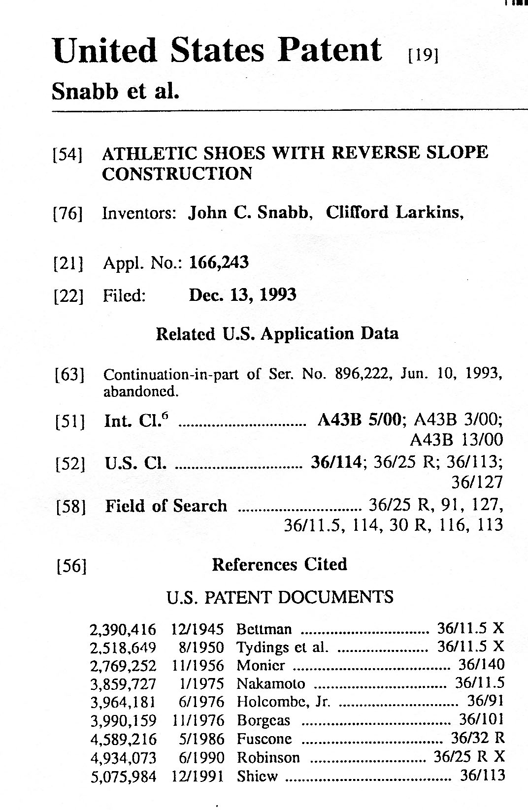 Abstract of patentNew application of biomechanical principles of elastic stretch and braking force are combined in an athletic shoe. The new design implements the concepts by placing the heel significantly lower that the ball of the foot and toes. Tests show that an inner sole reverse slope of about 3 1/2" provides an optimum significant improvement in jumping in particular. The reverse slope is substantially flat from the center of pressure beneath the heel to the five centers of pressure beneath the ball of the foot. The flat slope provides more assurance the weight of the user will be applied to the shoe through the centers of pressure in preference to locations under the arch. The invention is applicable to "explosive" movement sports such as basketball, track and field, volleyball, tennis and soccer. Preferably the shoes are constructed with formed or curved heels to retain the feet properly positioned in the shoes by preventing the feet from sliding too far back within the shoes. The increased athletic performance appears to arise from a two fold effect. First, the reverse slope because of the toe elevation additionally stretches the Achilles tendon resulting in the ability to generate greater jumping force as the calf muscle contracts. Second, the reverse slope because of the continuous flat nature of the slope, provides a greater stopping or braking force, thus improving the ability to convert forward momentum into vertical or lateral motion. |